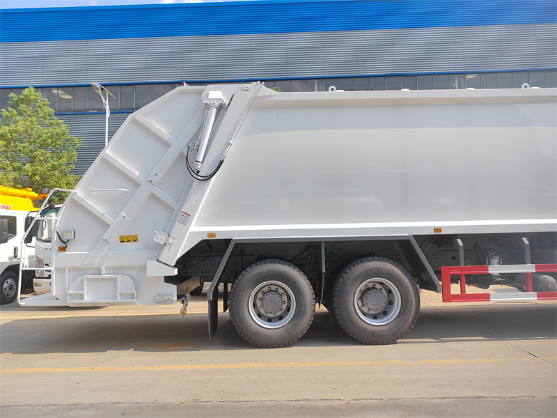 HOWO 6x4 22cbm リアローダー式ごみ収集車は、Sinotruk HW76 6x4 シャーシをベースに改造されています。ホイールベースは 4600+1350mm、エンジンは Weichai WP10.340E22、トランスミッションは Sinotruk HW19710 10 速です。上部ボディは、防錆処理を施した 22cbm の円弧状の炭素鋼製圧縮式ごみ収集ボックスです。後部にはフリップ機構はありませんが、人が立ってごみを捨てるための小さなプラットフォームがあります。投入口の両側には手すりがあり、側面には折りたたみ式のペダルがあります。この車両のごみの積み下ろしは、CAN-BUS 電子制御システムによって制御され、具体的には、キャブ内の電子制御ボックス、運転席側の手動油圧操作レバー、およびテールゲート電子制御ボックスによって制御されます。