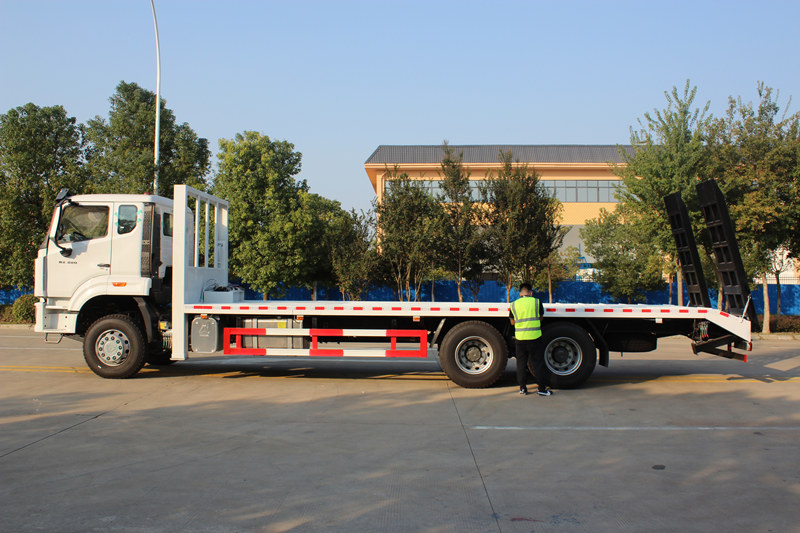 HOWO 25トン平床式セルフローダーは、SINOTRUK HOWOのヘビーデューティーシャーシをベースに、380馬力の高出力Weichai WP10.380E53エンジンを搭載し、ユーロV排出ガス基準に適合しています。上部構造は、油圧で3メートルまで拡張可能な長さ8,600mmの平床を備えています。デッキは10mm厚の滑り止め加工鋼板製で、25トンのフロント油圧アウトリガー、8トンの油圧ウインチ、2メートルの油圧折りたたみ式ランプが装備されています。これにより、大型建設機械の安全かつ効率的な輸送と積み下ろしが可能となり、建設現場、鉱山作業、物流輸送など幅広い用途で活用できます。