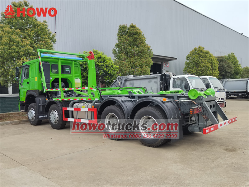 HOWO製8x4フックローダー式ゴミ収集車、HW76クラシックキャビン、カラー選択可能、手動傾斜装置付き、作業角度は70°以上、安全で便利