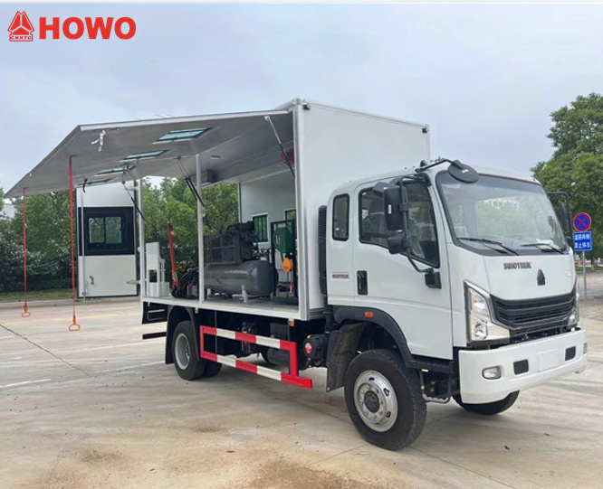 4200のHOWO 4x4 モバイルサービス貨物トラック この車両は、複雑な屋外作業環境向けに特別に設計された総合修理車両です。全輪駆動シャーシは強力なパワーを発揮します。使いやすい翼型上部シャーシには、油圧クレーン、ディーゼル発電機、エアコンプレッサー、ガス溶接機、燃料ディスペンサーが装備されており、機器の吊り上げ、溶接、電源供給など、本格的なメンテナンス作業が可能です。現場に迅速に到着し、すぐに作業を開始できます。