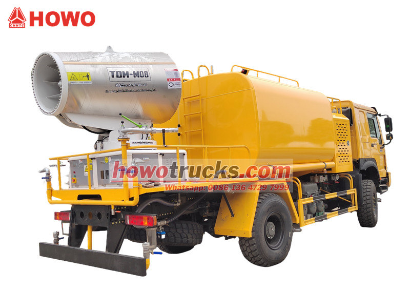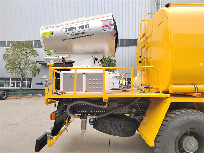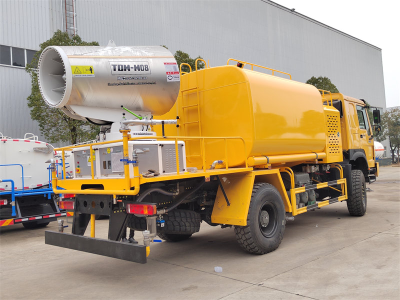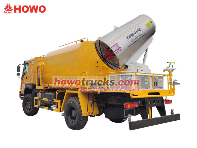 HOWO 4×4 ウォーターキャノントラックは、HOWOの全輪駆動シャーシをベースに、300HPエンジンと4×4駆動システムを搭載し、複雑な地形でも優れた性能を発揮します。90個のノズルを備えた超長距離80メートルウォーターキャノンを搭載し、最大20,000㎡の散布面積で微細な水ミスト(20~200μm)を噴霧できます。10,000Lの大容量水タンクと高圧噴霧システムを組み合わせることで、道路の粉塵低減、建設現場の粉塵抑制、農業用散布などの作業を効率的に実行できます。特に、鉱山地域、港湾、都市環境保護などの分野での粉塵対策に最適です。