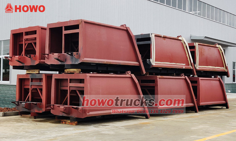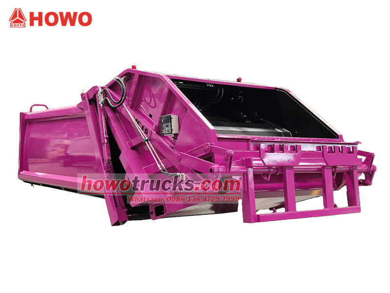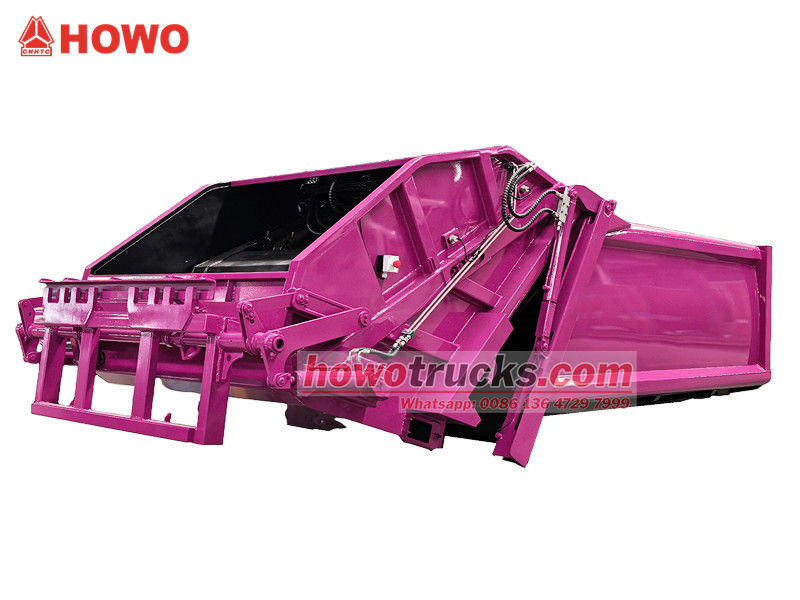 Howo 8cbm 圧縮式ごみ収集車の上部構造(リアローダー圧縮トラック上部ボディ、8cbm ごみ圧縮トラック上部ボディキット、ごみ圧縮トラック上部構造、廃棄物圧縮トラック上部ボディキット、リアローダー廃棄物収集トラックキットなどとも呼ばれます) 上部は8立方メートルのゴミ箱で、後部はバケット反転機構になっており、トラックの積み下ろし操作には3つの方法があります。