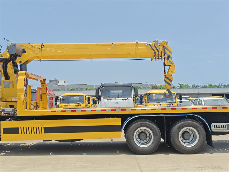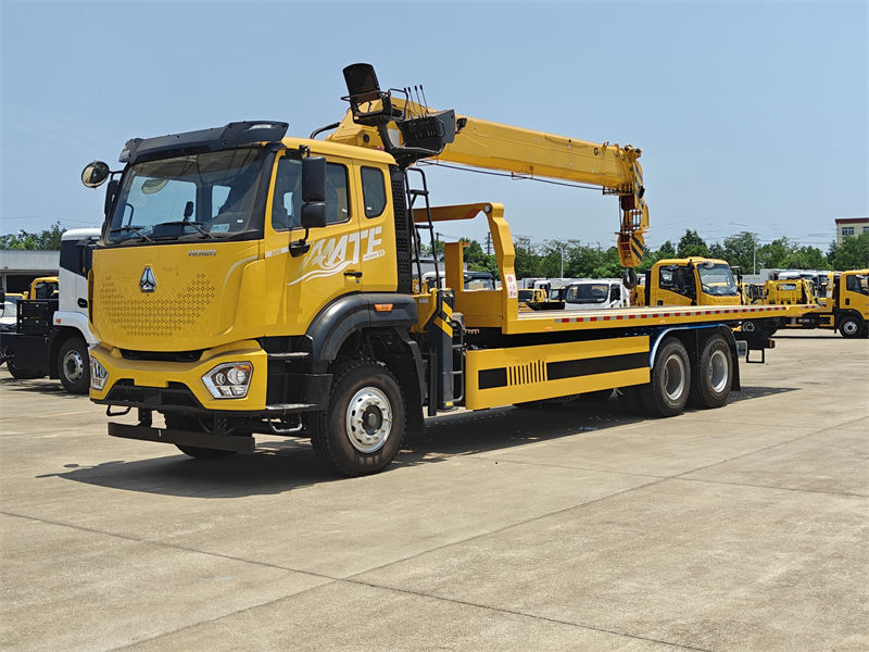13000*2これ Howo製フラットベッド式レッカー車(8トンクレーン付き) 多用途で優れた設計の特殊車両です。中国ブランドの玉柴エンジン製ディーゼルエンジンを搭載し、260馬力の強力な出力で様々な作業ニーズに対応できます。新型M9の高級キャブは3人乗りで、エアコンを装備しており、運転手やオペレーターに快適な運転環境を提供します。クレーンは伸縮ブーム式で、最大吊り上げ能力は8000kg、360°全方向回転が可能で、最大吊り上げ高さは16.5mです。