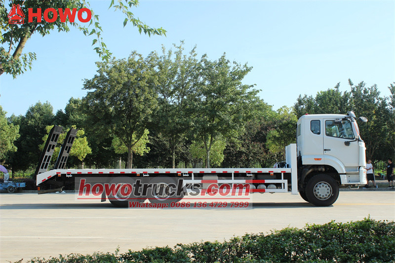 HOWO NX 20トン自走式トラックは、HOWO NX400 6x4シャーシを改造した平床式輸送トラックです。Weichai WP12.400E201エンジンとSinotruk HW19710ギアボックスを搭載しています。上部ボディは、厚さ8mmの滑り止めパターンプレートと120x120x5mmの国家規格角形鋼管の底梁を備えた7.5x2.5メートルの平床です。後部は、長さ2.2メートルの機械式スプリングタイプの全鋼製機械式ランプです。ランプには後部アウトリガーも装備されています。車両の前部には、油圧アウトリガーと45メートル20トンウインチが装備されています。後部の左右の操作レバーで、油圧アウトリガー、ウインチ、機械式ランプなどの操作を制御します。