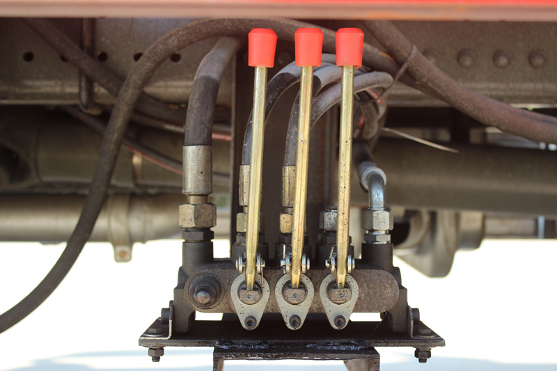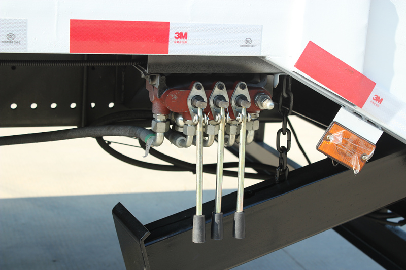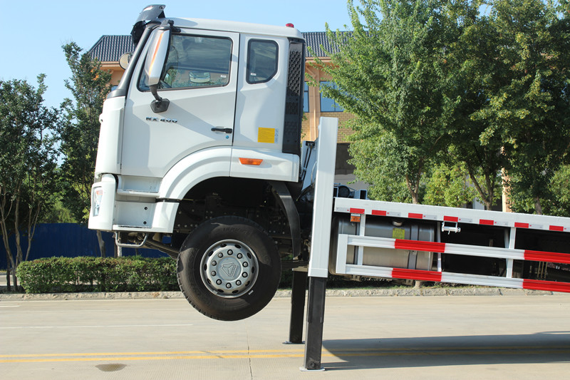 ◇油圧式アウトリガー: この車両は、前部に2つの大容量油圧式アウトリガーを装備しています。これらのアウトリガーは、積み下ろし作業中に降ろされ、車両の前部を安定的に支え、車両前部の傾きを防ぎ、安全かつスムーズな積み下ろし作業を実現します。