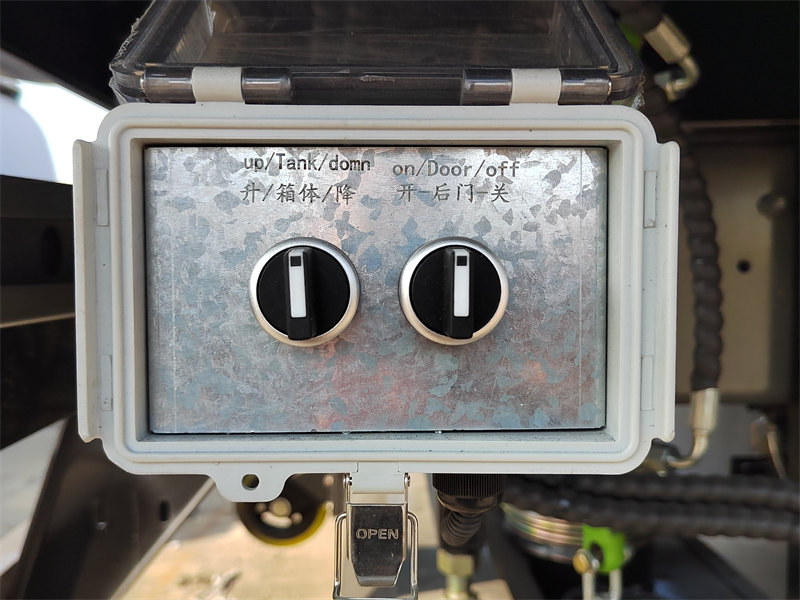 タンクの後部ドアには油圧式ピンロック機構が装備されています。このシステムにより、ドアの開閉とロックをワンタッチで自動で行うことができ、確実な密閉性を確保することで、廃棄物や汚水の漏れを効果的に防止します。