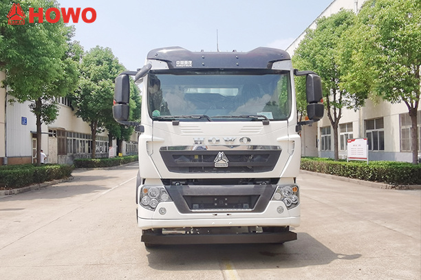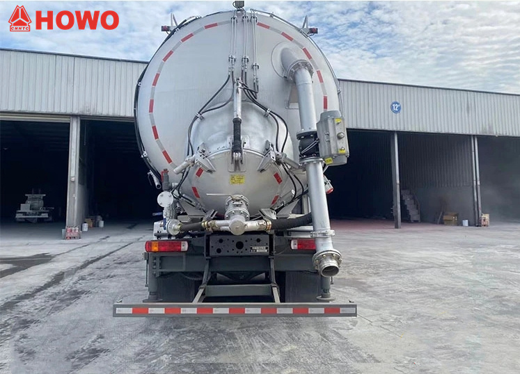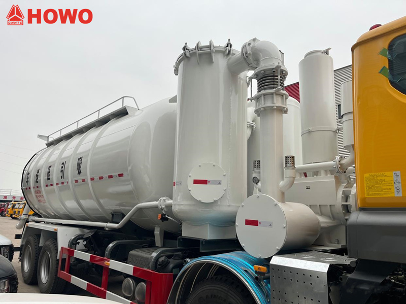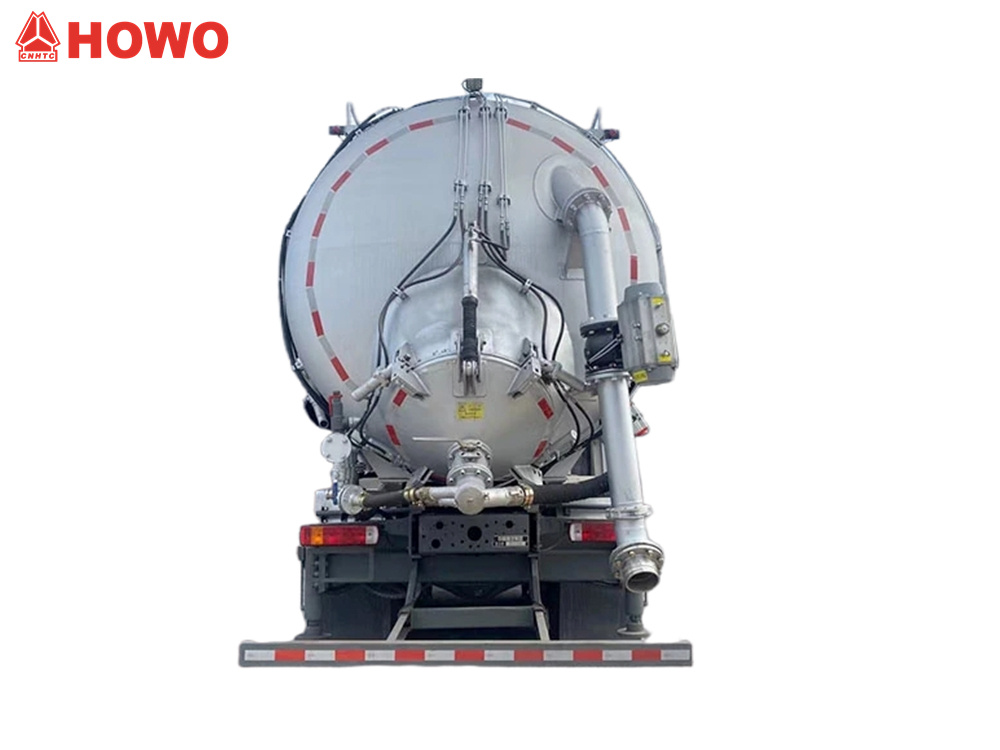 HOWO TX350 8x4シャーシをベースに改造されたHOWO 8x4 25立方メートル吸引・加圧コンベア車両。ホイールベースは1800+4600+1350mmと長く、Sinotruk MC07H.35-60エンジンとHW15710Lギアボックスを搭載。上部ボディにはバッグフィルターが完備され、後部は貯蔵タンクとなっている。油圧アウトリガー、ファン、外部空気源吸気管、真空ポンプ、エアコンプレッサー、リフティングシリンダー、ろ過システム、吸引・排出配管システム、電子制御ボックスなどを装備。真空ポンプは負圧吸引、エアコンプレッサーは正圧排出となる。
