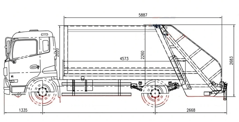 ●この車両は後部に傾斜機構を備えており、ゴミ箱またはホッパーを自動的に傾けてゴミを圧縮室に送り込みます。油圧式プッシャーがゴミを複数回圧縮し、元の体積の約3分の1にまで縮小することで、積載量を大幅に増加させます。